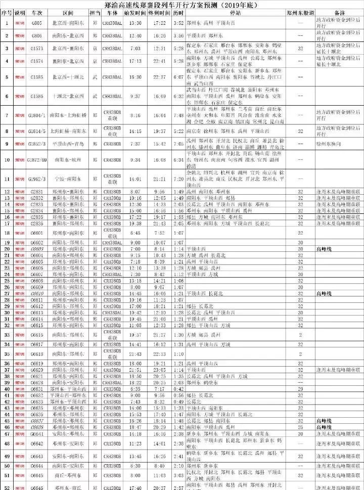铁路局一个工作人员发布的关于2019年底商杭高速线商合段、郑阜高速线、郑渝高速线郑襄段、西武高速线孝十段开通情况的预测及说明中获悉郑万高铁,