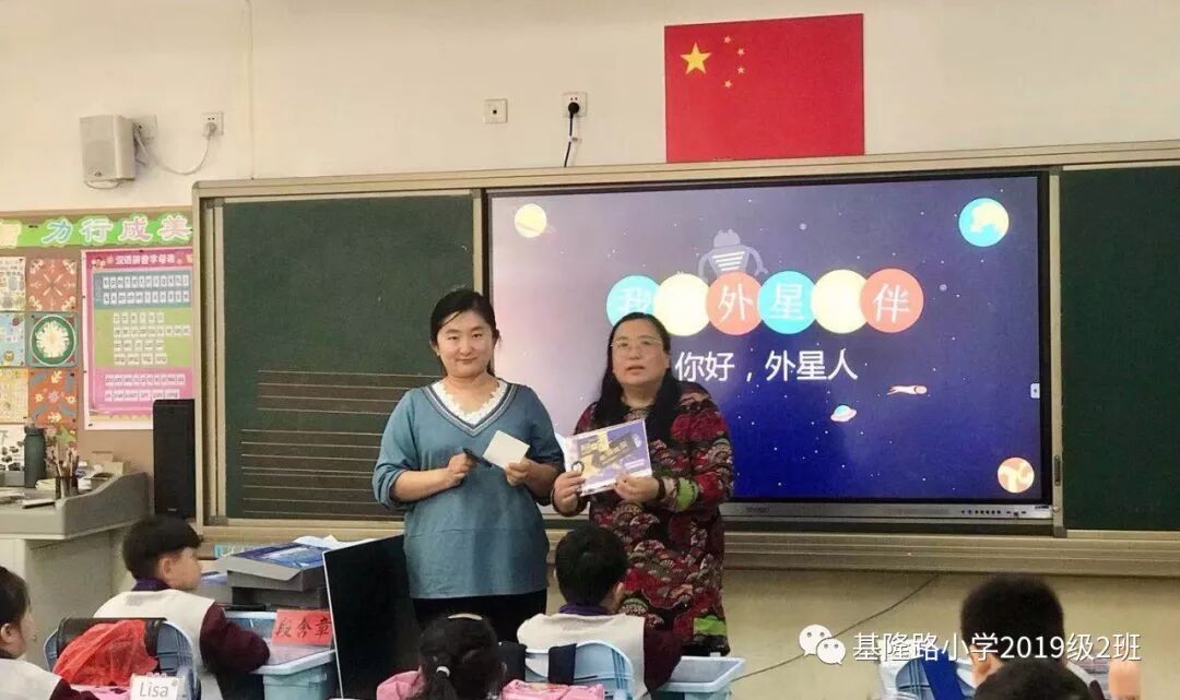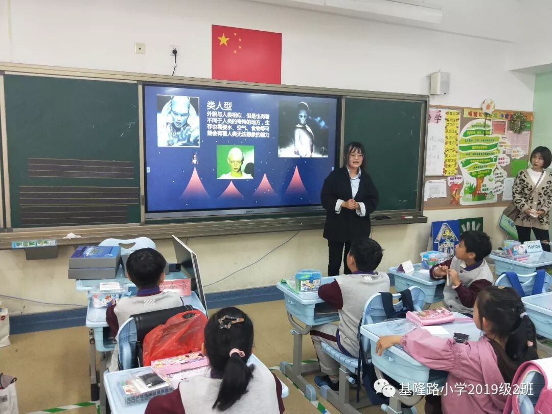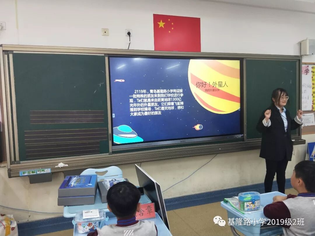 2119年,青岛基隆路小学的小朋友们正在等待他们邀请的一批特殊的客人的到来,随着一道银光闪现,来自1300亿光年外的星球上的外星人朋友乘着飞船降落到了基隆路小学的操场上…….这是2019年10月21日上午青岛基隆路小学一年级二班教室的大屏幕上正在放映的内容。小朋友们睁大眼睛,聚精会神的看着,他们早已经插上了一双想象的翅膀,飞到了100年后,正在和外星人交朋友……