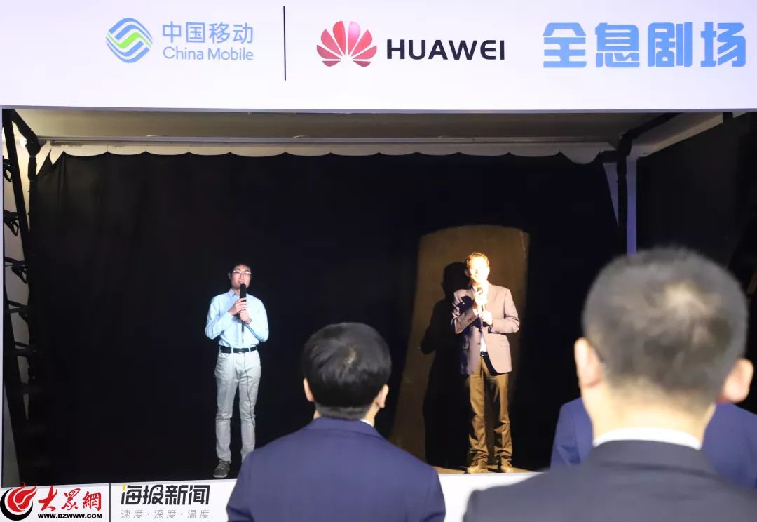 讲解员与5G实时传输的华为工程师的全息影像(左)隔空对话