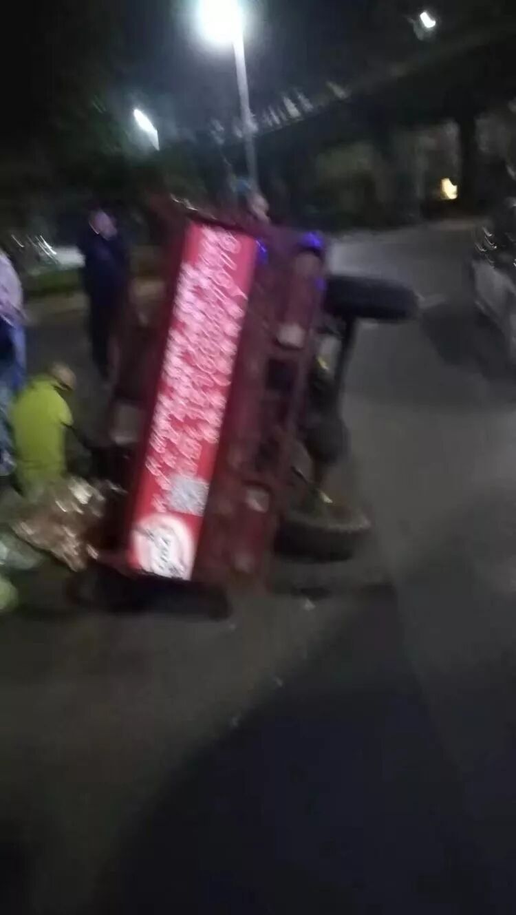 10月21日凌晨3时30分许,在雁山立交桥下,一辆拉蔬菜的三轮车发生意外,与两辆轿车相撞,之后侧翻。两名50岁左右的男子受伤,其中一人头破血流,另外一有人倒地不能动弹,两人均有意识。“两名男子是三轮车上的,轿车上的人没有大碍。”据现场人员辛先生介绍,意外发生后,三轮车上的菜撒了一路,现场人员拨打120急救电话并报警。