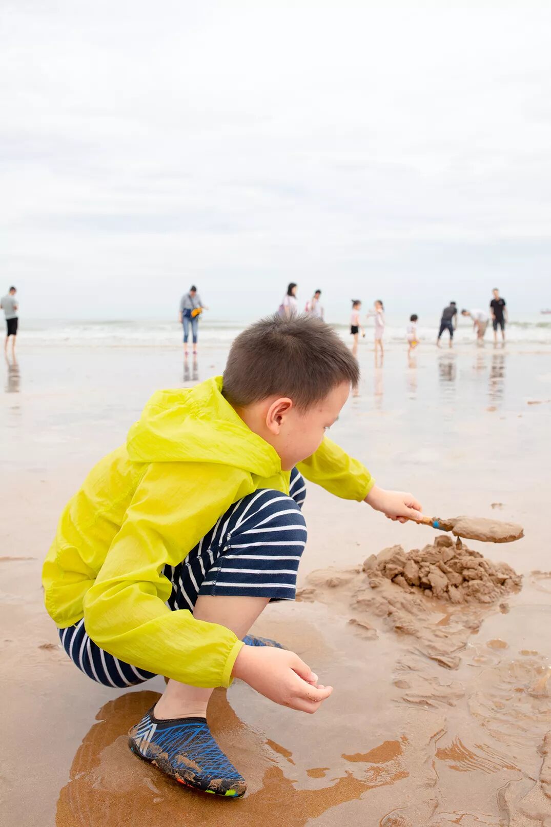 特意安排了大半天时间来到石老人海滩让多多尽情的接触大海/挖沙