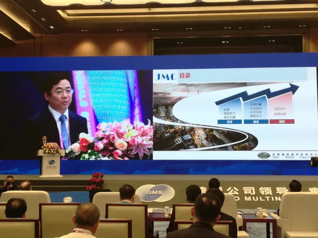 济南国际医学科学中心管委会主任张端武对医学中心做了专题推介,从融入国家战略、助力“健康中国”“健康山东”建设和推进济南市国际康养名城建设等几个方面展示了建设医学中心的背景和必要性;全面介绍了医学中心坚持“国际化、高端化、特色化”原则,秉承生产、生活、生态“三生融合”理念,以精准医学为方向、康复医养为特色、数据产业为支撑、教育研发为基础,打造政产学研金服用‘北斗七星’创新生态体系,建设国家区域性医学科学高地、产城融合的未来健康产业城”的战略定位,以及建设医疗硅谷、生命科技创新产业区、生态康复颐养示范区、健康智慧生活实践区四大功能园区,打造产城融合、智慧生态的“国际智慧医学城,绿色健康示范区”的发展愿景;重点介绍了医学中心重点项目建设、重大平台建设和“双招双引”方面取得的重要进展,以及“三年聚集资源、五年初具规模、十年国内领先、十五年国际引领”的发展路径。