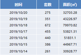 具体到单日来看,成交峰值出现在10月18日,当日成交套数为672套,成交面积为79970.82㎡;成交谷值出现在10月14日,当日成交套数为261套,成交面积30928.77㎡。平均来看,上周单日成交约406套。
