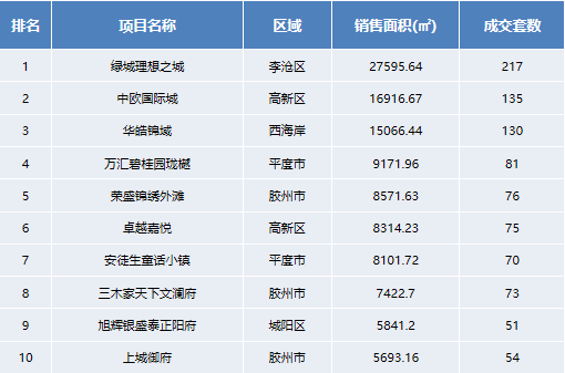 而位于高新区的中欧国际城则以上周成交套数135套,销售面积16916.67㎡的成绩,获得青岛单盘成交面积榜、成交套数榜“双料”亚军;