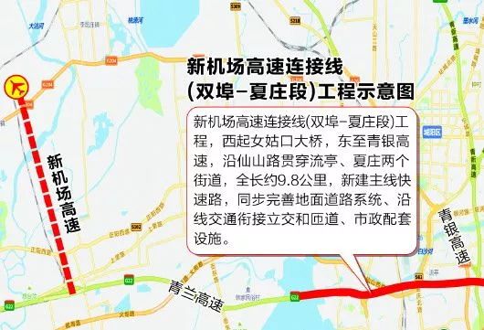 按照规划,该职能将部分通过新机场高速连接线(双埠-夏庄段)实现,据介绍,新机场高速连接线工程西起女姑口大桥,东至青银高速,全长约9.8km,同步实施青银高速互通立交1座,双流高架连接匝道及重庆路西侧临时接地匝道2对,高架辅路位于南流路东侧接地,预留远期重庆路互通立交和黑龙江路匝道建设条件。