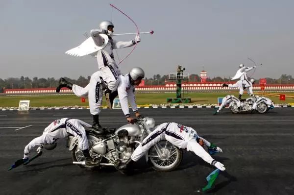 前面提到印度人特别擅长瑜伽,因此身体的柔韧性好,将英国陆军皇家信号兵摩托车表演,继承下来并得以持续发扬光大,成了极富印度军队特色新德里国王大道上阅兵中保留的传统项目。