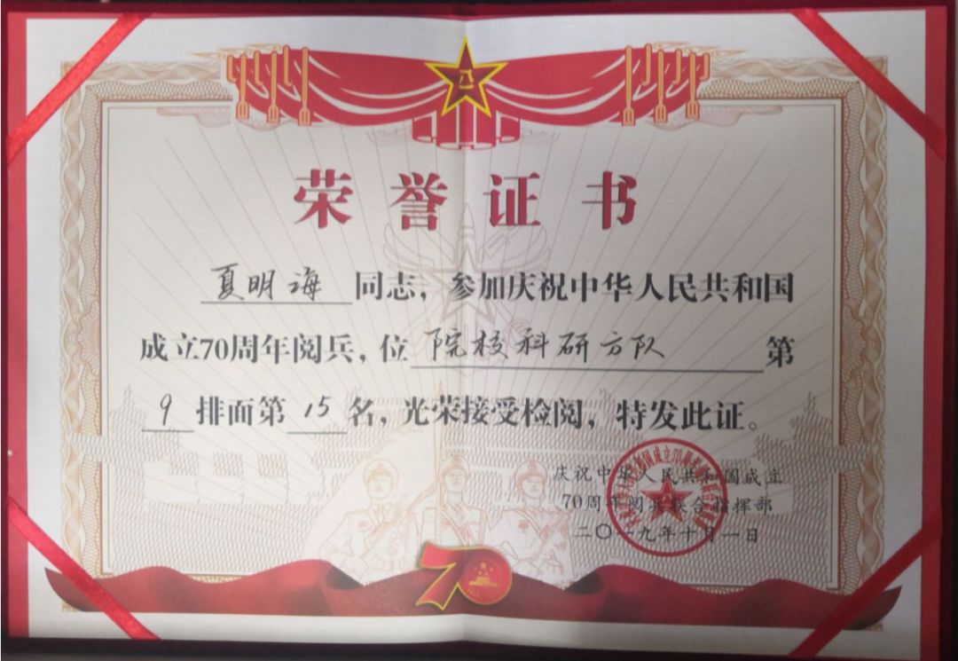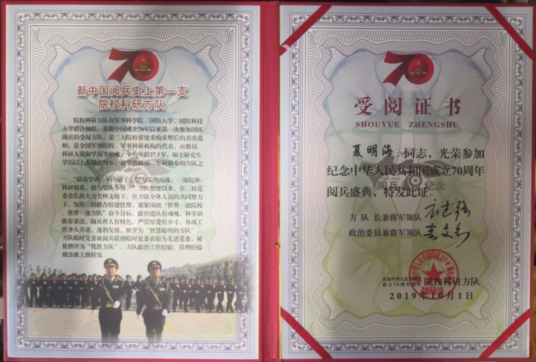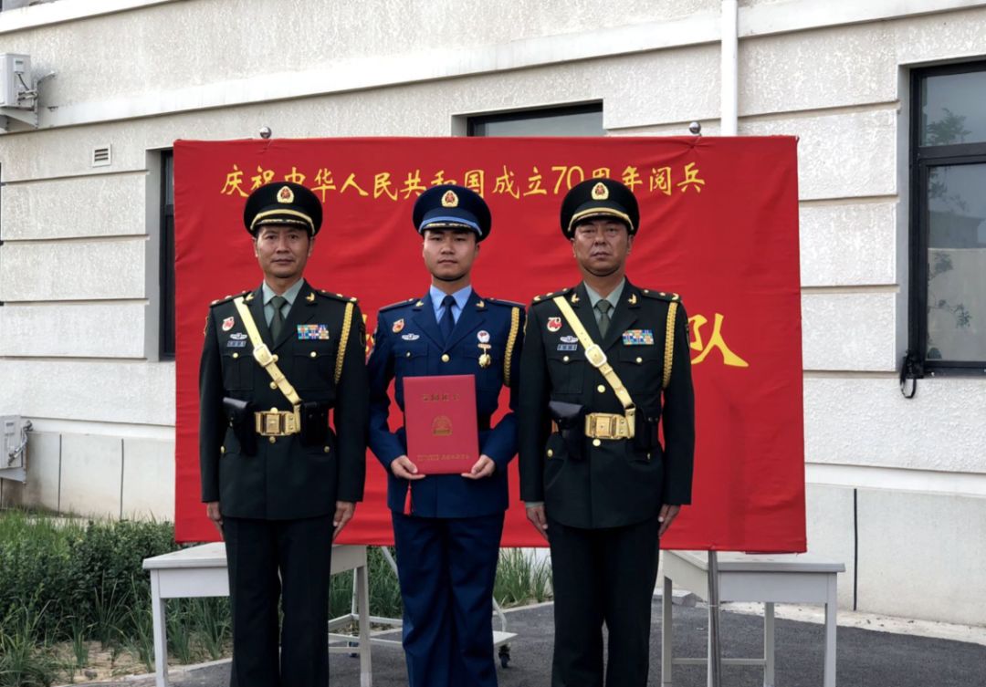 2019年年初,在学校上课的夏明海,得知有机会参加70年阅兵的消息时,十分高兴。他毫不犹豫与学校选拔出的150人一同奔赴北京参加训练,在国庆那天踢着正步完美走过天安门,接受党和人民的检阅。