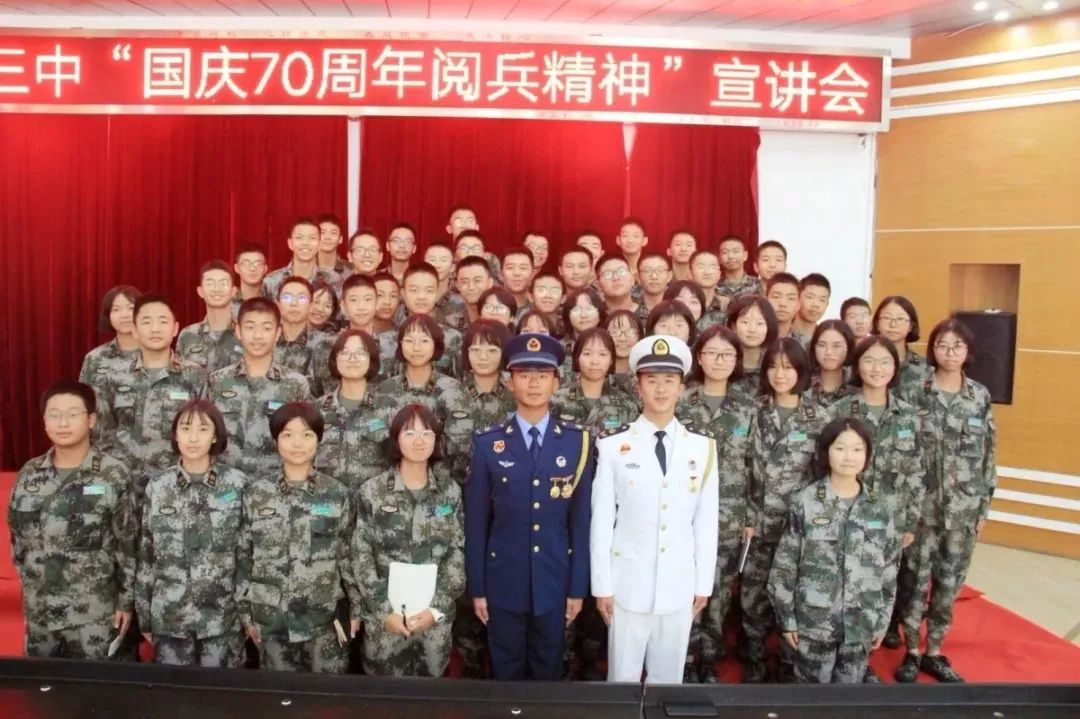 “哇,太帅了,太酷了,这两个兵哥哥,果然与电视上看到的天安门广场阅兵方阵战士一样威武。”一下课,浏阳三中校园顿时沸腾了。10月18日上午,浏阳三中党总支邀请两位参加国庆70周年阅兵盛典的浏阳籍士兵吉冬冬和邓志怡来到学校参加”弘扬阅兵精神,建功新时代“宣讲会,两位受阅战士与我校国防教育班全体师生分享参训和受阅经历。