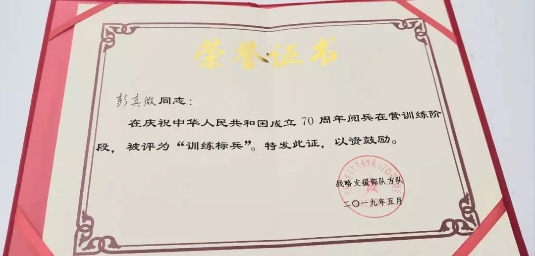 2019年3月,经过所在部队层层严格筛选,彭真微以良好的综合素质成功入选庆祝中华人民共和国成立70周年阅兵仪式战略支援部队受阅方队成员,成为军中骄子。