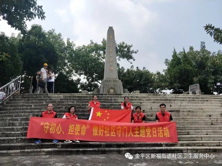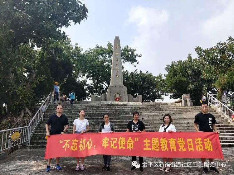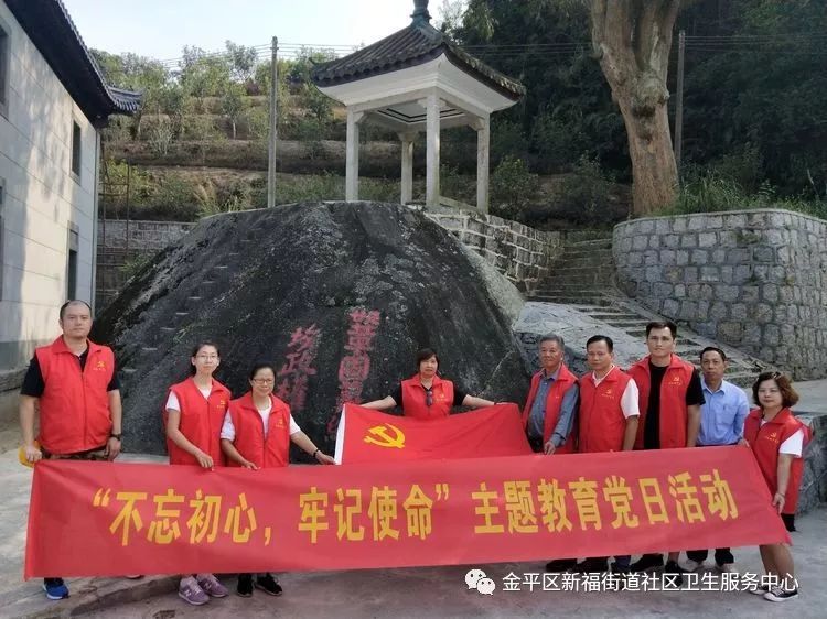 为全面贯彻落实习近平时代中国特色社会主义思想和党的十九大精神。进一步提升金平区新福街道社区卫生服务中心党员干部的思想认识,锻造一支忠诚担当,干净干事,勇立潮头的基层医疗服务队伍,2019年10月19日,在中心党支部书记黄汉腻同志的带领下,组织全体党员干部赴大南山红场雷岭革命战争时代的革命根据地,开展“不忘初心、牢记使命”主题教育党日活动及“守初心、担使命”做好社区守门人主题党日活动。