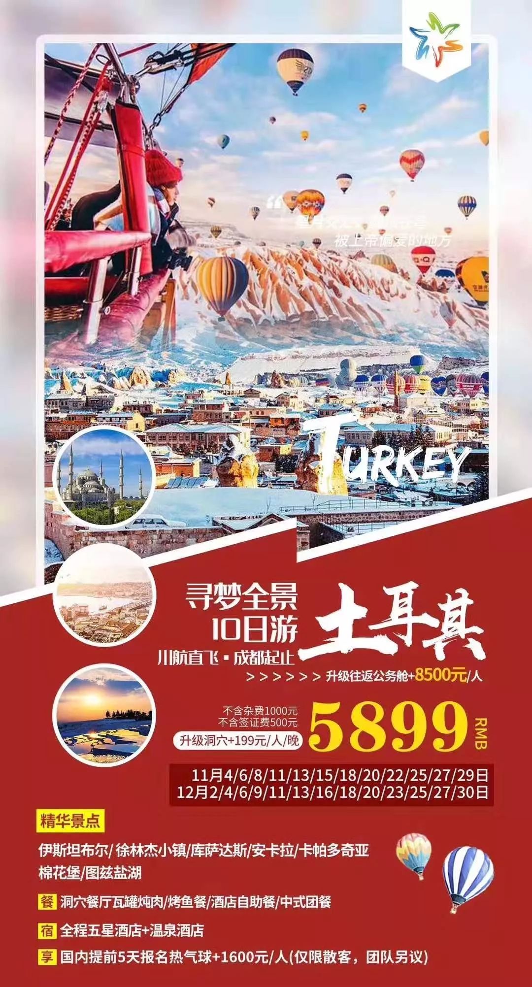 12、【土耳其】---浪漫的天蓝色之旅,乘坐浪漫的热气球,赏地中海与爱琴海美景,迷人的自然风光,丰富的文物古迹使土耳其享有“旅游天堂”之誉,然而,今天土耳其深深吸引游客的是各种文化、新与旧、东方和西方、现代与传统的完美融合,土耳其地理位置和地缘政治战略意义极为重要,是连接欧亚的十字路口。