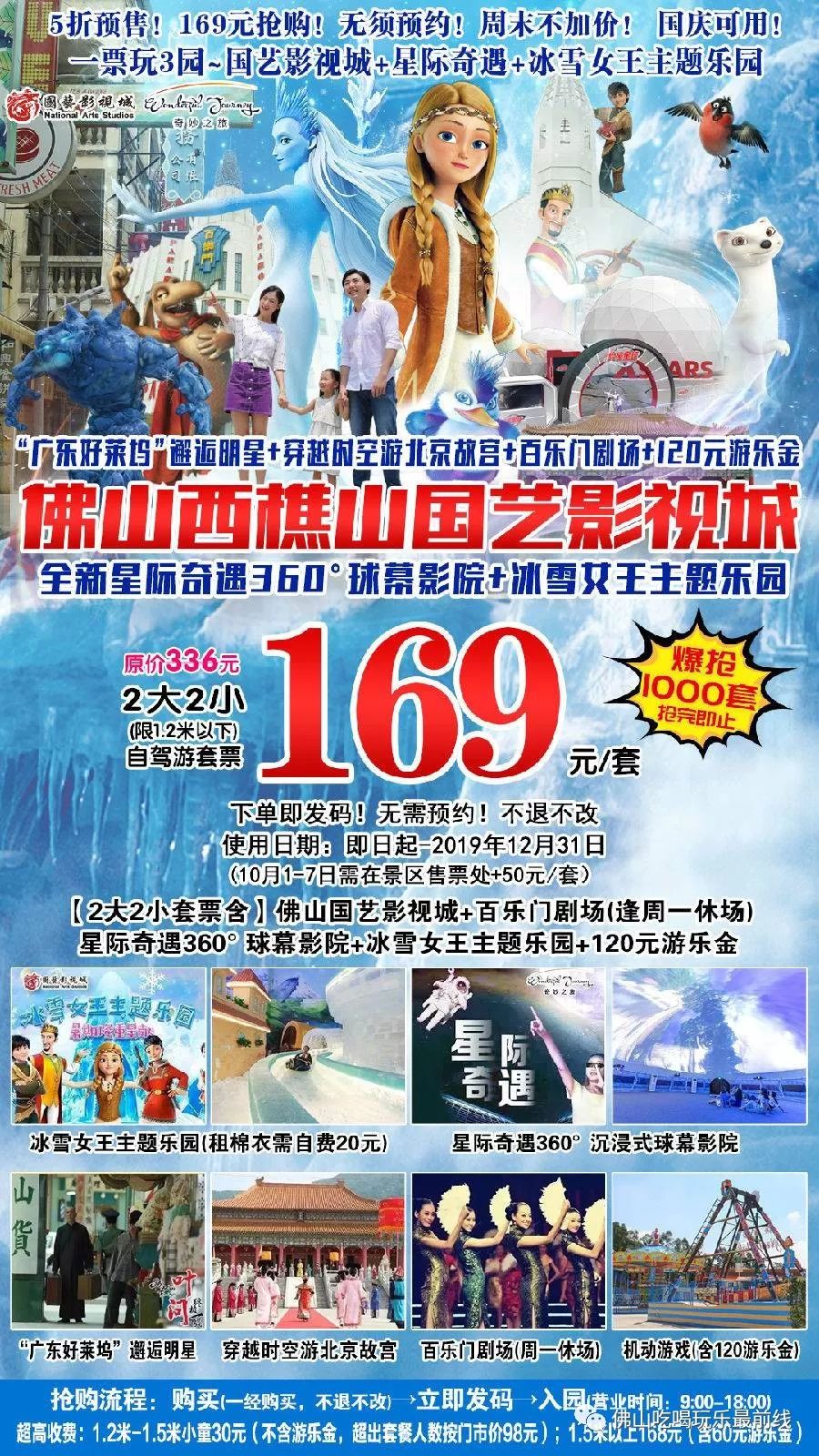 佛山西樵山国艺影视城+百乐门剧场(逢周一休场)+星际奇遇360°球幕影院+冰雪女王主题乐园+120元游乐金