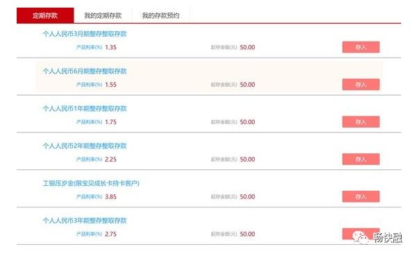 工行官网显示,工行提供的定期存款产品起存金额为50元。定存期限越长,产品利率越高。此外,官网上的定存产品为整存整取,是一种约定存款期限,到期一次性支取本息的储蓄存款。而记者注意到,“银行储蓄”提供的工行定存产品利率较官网上的起存金额更高,定存利率更高,次日起息,具有随存随取等特点。