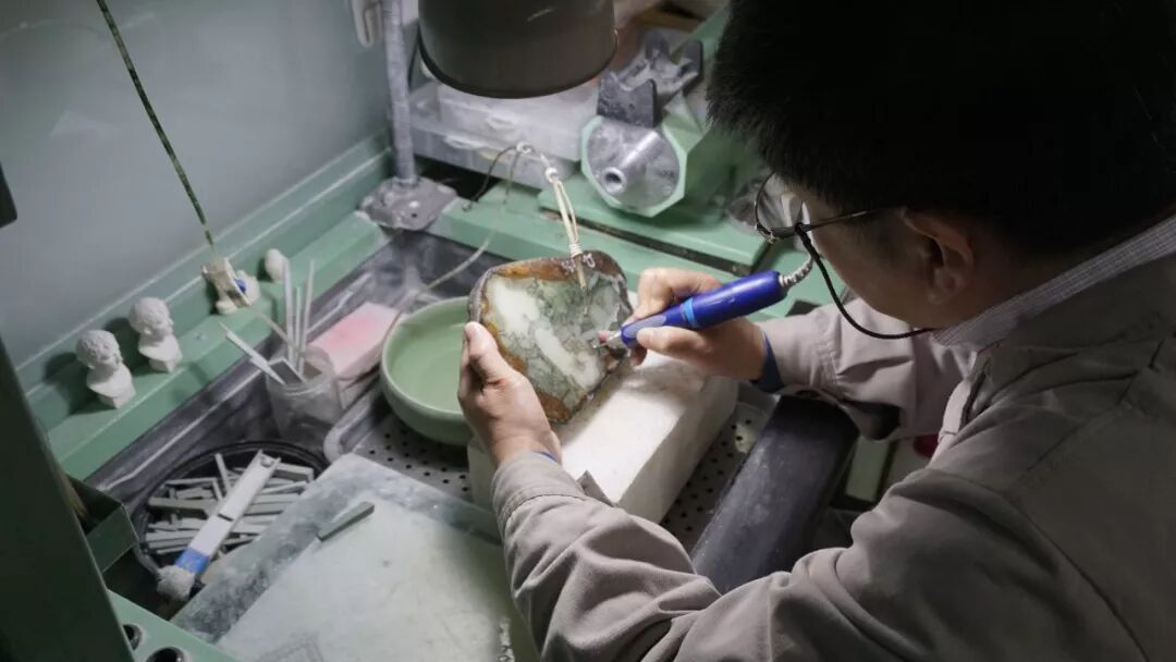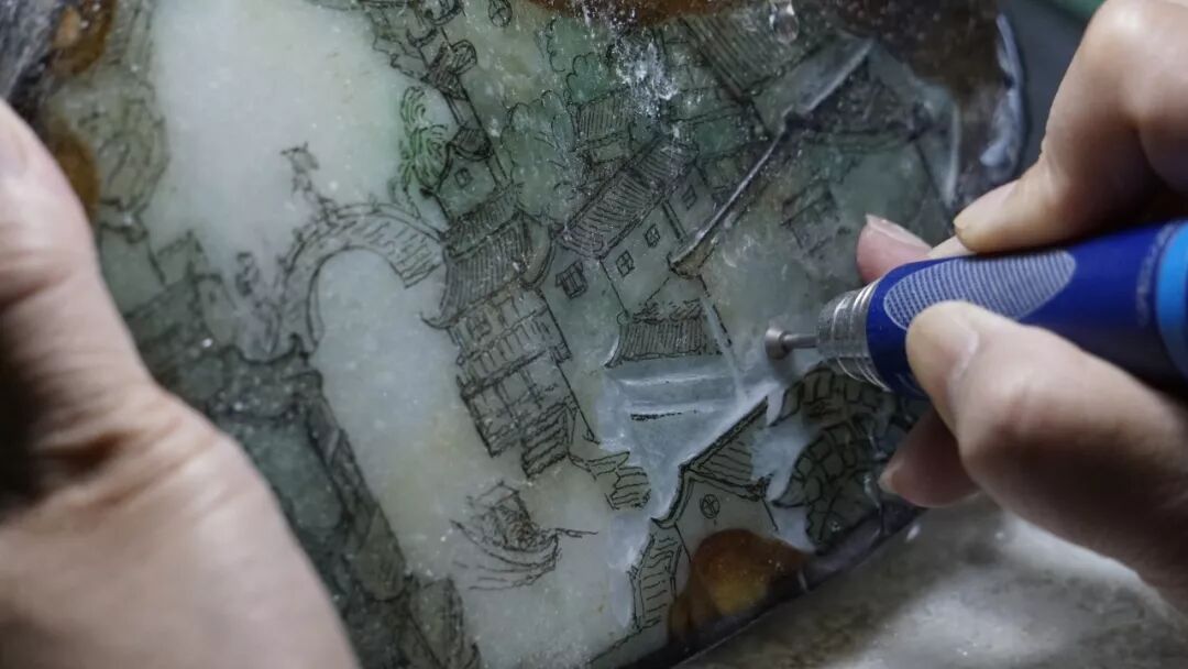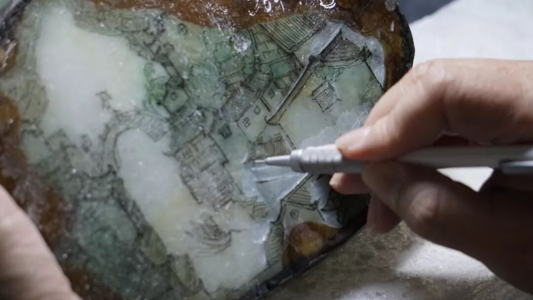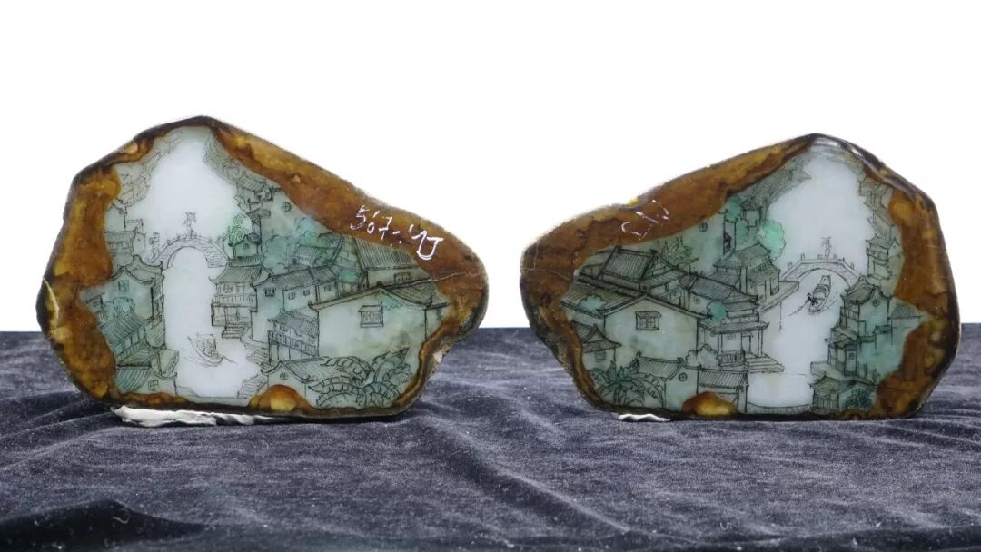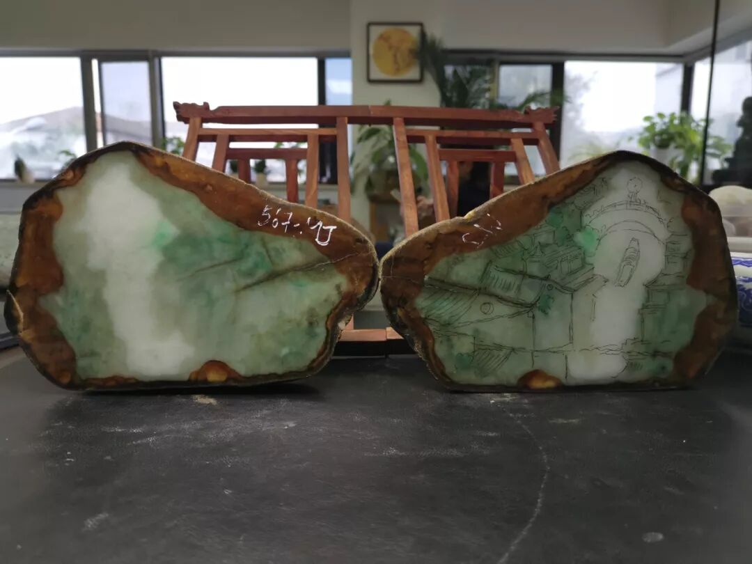水乡人濒水而居,为世人留下千古绝唱。眼前的这一切美景在翠绿的芭蕉树映衬下,顿时灵感来了。记录生活中的美景,不同的人有不同的记录方式,诗人寄情于文字、画家手中有笔墨、摄影家按动手中的快门。我们玉雕师傅也有自己的方式,遂回京之后,根据材料的特点,用这对儿翡翠记录了这幅我难以忘怀的江南之景。“奋笔疾书”开始雕琢中。。。。