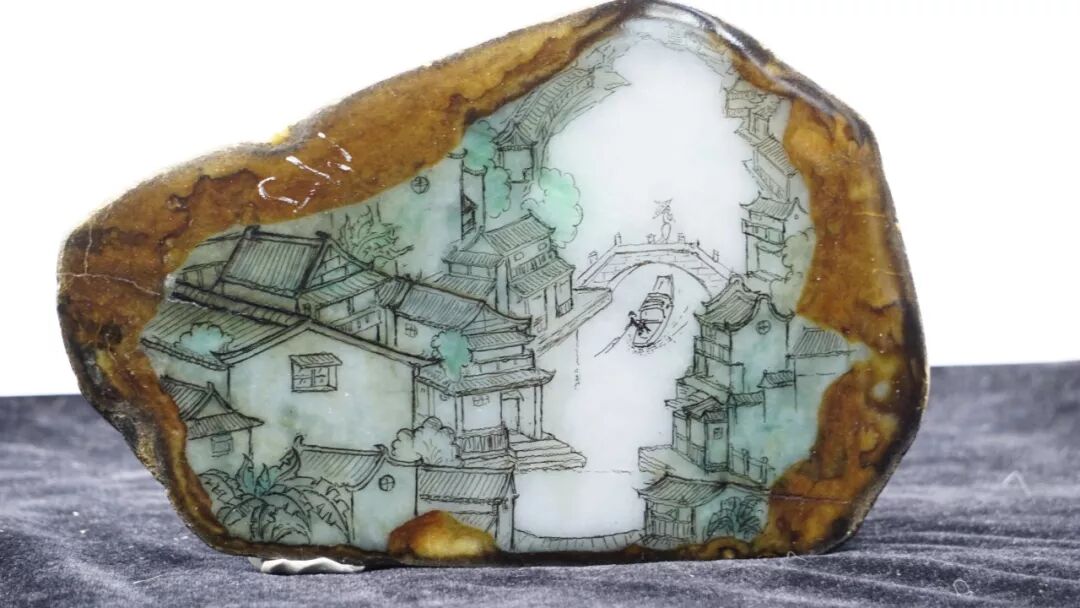 中间是白色细肉,泛起点绿,边缘是红雾,红雾越够厚,且有种水,是老种的表现。放置案头数月一直未有好的构思。今年四月和七月,受友人之邀,两次去江南水乡游览,小桥流水,感受颇深。江南是一个人杰地灵、山清水秀的地方,流动的河水,摇曳的乌篷船,古老的房屋,斑驳的墙壁。