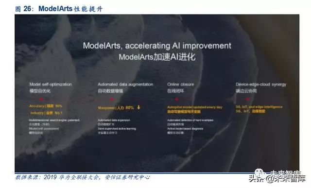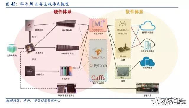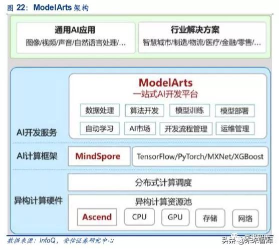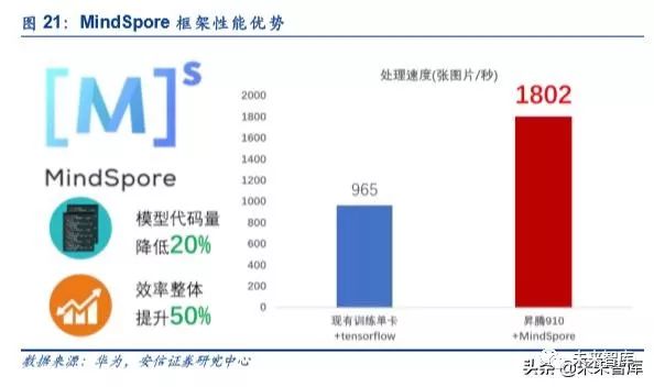(3)软硬一体结合,优化昇腾平台运行性能。谷歌 AI 云性能强大的原因之一来自于谷歌针 对自研 TPU芯片在 AI 开发框架 tensorflow上做了大幅优化。华为作为一家拥有自研芯片的科技巨头,同样对针对昇腾芯片在 MindSpore 上做了软硬一体优化,大幅提升 MindSpore 的性能表现。