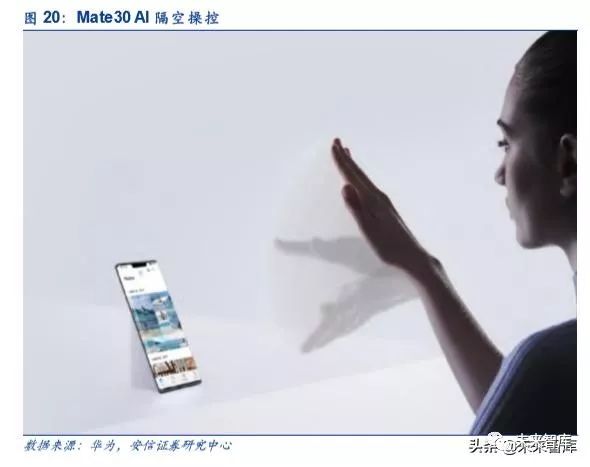 (1)智能 AI 使能隔空操作。传统的智能手机都需要手触屏来操作系统,包括点开 APP,拍照,截屏等功能均需要触屏的支持,相比之下,MATE30 可以让使用者在没有触碰屏幕的情 形下,就直接操作系统。例如,利用双手握拳,达到截屏的效果。