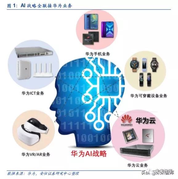 2019 年 7 月,华为总裁任正非在主题为《钢铁是怎么炼成的》的讲话中提到,“5G 就是一个小儿科,过于被重视了。5G 提供高带宽、低时延,支撑的是人工智能,人工智能才是大产业。”华为作为传统的ICT 商,进军 AI 领域绝非头脑发热或盲目跟风,而是出于对自身业务整合的深入考量。AI 作为当今科技界技术风口,不仅拥有广阔的潜在市场空间,同时可以 将华为 ICT、消费电子、IoT、云服务等业务联接起来。