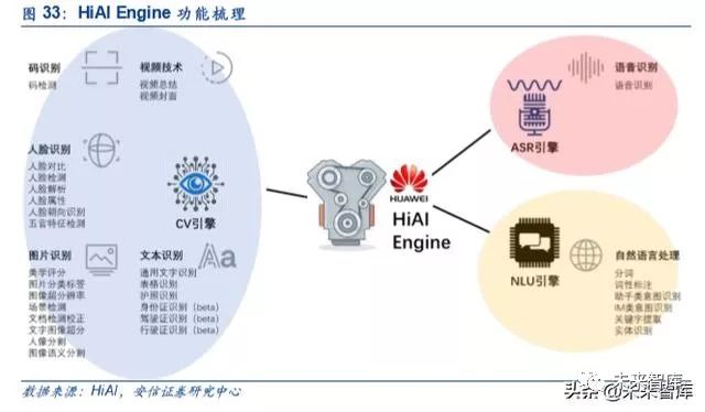三大引擎护法,主流 AI 场景全覆盖。目前,深度学习相关应用公认的三个基本场景是计算机 视觉、语音识别和自然语言处理,已被 HiAI Engine 提供的 CV 引擎、ASR 引擎、NLU引擎 完全覆盖。同时,基于三大引擎,HiAI Engine 已衍生出了人脸识别、图片识别、自然语言处 理、码识别、视频技术、语音识别、文本识别 7 大类应用,以及其下的 28 小类应用,涵盖 了各类主流 AI 应用场景。