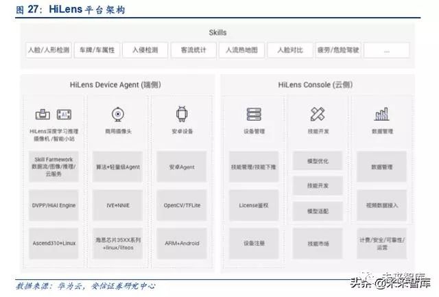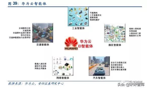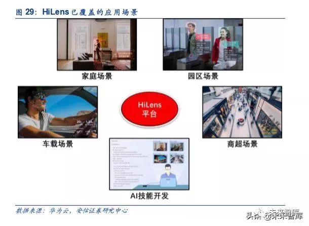 (2)优选入局时点,充分依托自有产业优势。华为作为传统的通信设备商,在云服务器与手 机终端领域有很大的市场份额。同时,华为也早已开启 HiLink 等物联网平台为 AIoT 战略铺 路。随着 AI 算法逐步成熟,AI 机理层面的革新力度将逐步减弱,而对应用场景拓展的需求逐步提升。这意味着,从设备、平台及终端反向渗透 AI 市场的机会已然到来,能够夯实项目 落地的科技公司将会脱颖而出。