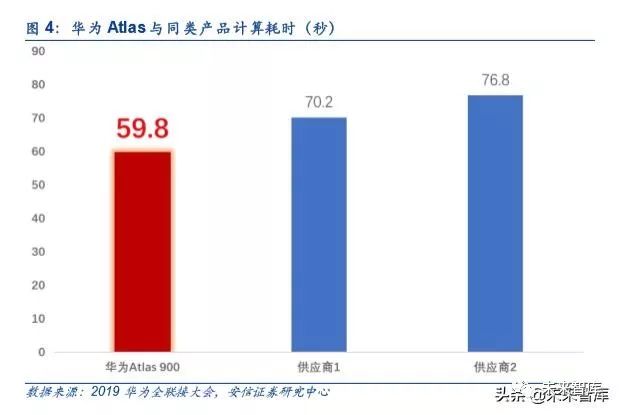 (1)Atlas 900 训练集群:定位于大规模问题 AI 训练集群服务器。Atlas 900 搭载数千颗昇腾 910,并充分利用了华为在集群通信库和作业调度平台上的技术积累。Atlas 900 在 16 位 浮点运算上的总算力达到 256-1014FLOPS,相当于 50 万台 PC 的计算能力。在 ImageNet 数据集上针对 ResNet-50 模型的训练时间相比于竞争对手提高了10 秒,是目前 AI 集群计算的全球第一。