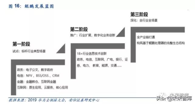 发布白皮书,制定发展蓝图。华为于 2019 年 9 月发布《鲲鹏计算产业发展白皮书》,公布了鲲鹏长期的发展蓝图。开放、共享的生态体系是鲲鹏计算产业成功的基础,要构建全行业、 全场景鲲鹏计算产业体系,完成鲲鹏计算产业从关键行业试点到全行业、全场景产业链建设 目标,总体上来讲,计划分为试点、推广、深化三个阶段来实现。