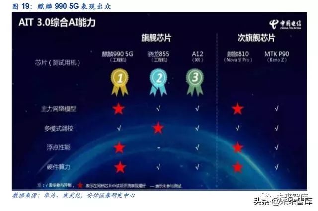 麒麟 990 5G 综合 AI 能力第一,彰显 AI 实力。根据《中国电信 2019 年终端洞察报告》及中 国电信自主研发的 AI 评测工具 AIT 3.0,相比业界其他 AI 芯片性能,在主力网络模型、多模式调校,浮点性能和硬件算力等维度上的测评中,麒麟 990 5G 综合表现业界最佳,与此同 时,麒麟 810 也展现出强劲的 AI 能力。