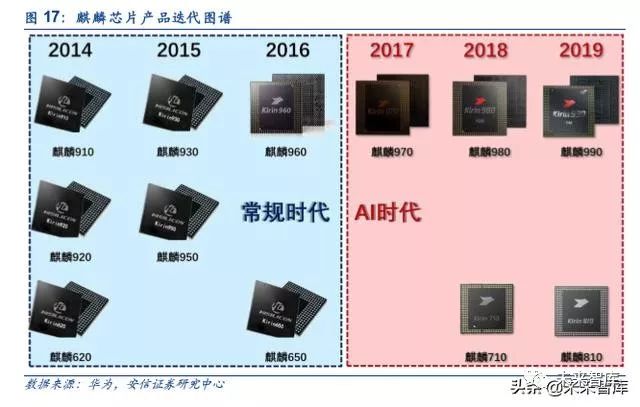 多代迭代,臻至完美。麒麟芯片由华为海思自主研制,已经历了超过 12 代产品迭代。麒麟 芯片的前身是 2012 年推出的华为手机芯片 K3V2。通过两年的技术完善,第一款正式的麒麟芯片产品麒麟 910 于 2014 年初推出。麒麟 910 是全球首款 4 核手机处理器,搭载了 Mali-450MP4 的 GPU。其后,麒麟芯片针对高端应用和低端应用手机产品分别推出了一系 列产品,大幅提高了各方面性能。至麒麟 970,AI 技术成为麒麟芯片标配,并持续迭代至今。麒麟芯片的最新产品是麒麟990,其首款7nm EUV 工艺打造的芯片,进一步强化了 AI 功能。