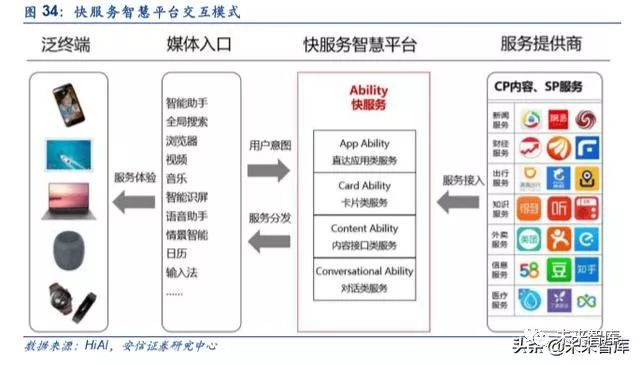 快服务智慧平台:华为统一的原子化服务接入和分发平台,起到流量入口的作用。快服务智慧平台提供多种接入方式,包括内容接口类快服务、卡片类快服务、直达应用类快服务。目前,快服务智慧平台已具备新浪新闻世界杯、百度地图等成功案例。快服务智慧平台不仅是 HiAI Service 的一款产品,更是承载华为快应用战略的重要依托。