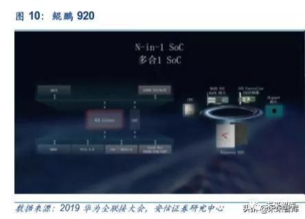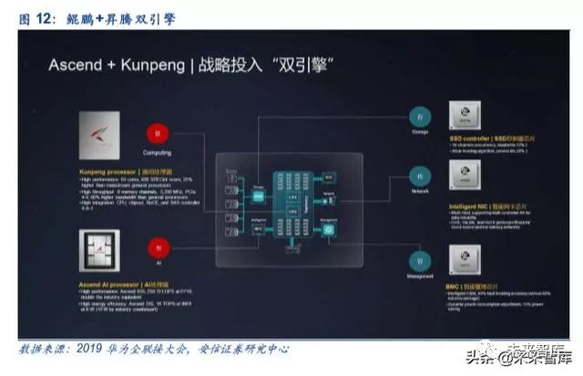 我们在报告《华为:鲲鹏展翅,壮志凌云》深入剖析了华为的鲲鹏战略,以及其作为国产化 生态系统数字底座的角色。2019 年华为全联接大会上,鲲鹏芯片再次成为焦点,多场主题演讲及专题演讲均围绕鲲鹏展开。鲲鹏包括服务器和 PC 机芯片,鲲鹏 920 是业界首颗 64 核的数据中心处理器,性能比业界主流处理器高 25%、内存带宽高 60%;同时把 CPU、桥 片、网络和磁盘控制器“4 合 1”,是业界集成度最高的数据中心处理器。鲲鹏芯片按照“量产一代、研发一代、规划一代”的节奏发展,从 2007 年走到现在已历时12 年,鲲鹏 920 现在是第三代芯片。我们认为,鲲鹏芯片不仅仅是国产化领域的数字底座,也将充当智能计算领域的数字底座,是华为战略的重要一环。