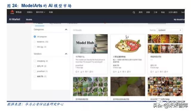 ModelArts 开放 AI 模型市场,加快落地。AI 市场是基于 ModelArts 构建的开发者生态社区, 提供 AI 模型、API 交易、数据、竞赛案例等内容共享功能。为高校科研机构、AI应用开发商、 解决方案集成商、企业及个人开发者等提供安全、开放的共享及交易环境,有效连接 AI开发生态链各参与方,加速 AI 产品的开发与落地。