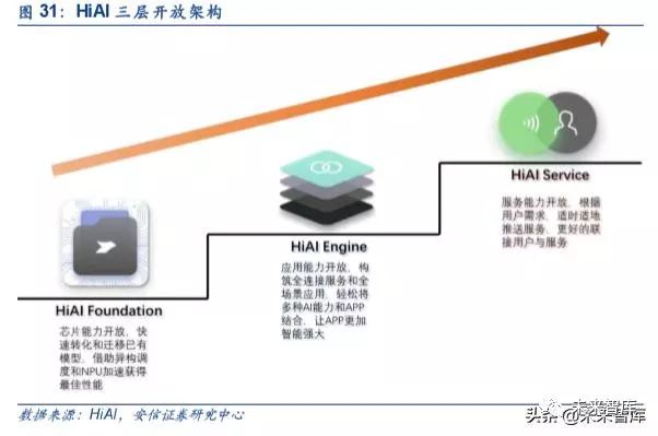 HiAI 基于“芯、端、云”三层开放架构,由底层架构至上层架构分别为 HiAI Foundation, HiAI Engine 和 HiAI Service。