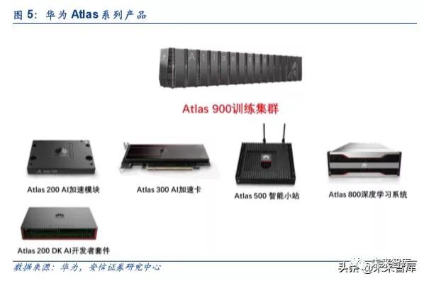 昇腾芯片加载板卡,Atlas 一体化产品遍及全栈应用场景。华为效仿谷歌等公司的思路,并 不将昇腾芯片作为一款独立的产品,而是集成板卡销售一体化产品。目前,华为已推出一些 系列 Atlas 人工智能计算平台产品,应用领域遍及云侧至端侧全栈。传统的 Atlas 平台现阶段主要搭载昇腾 310 芯片,性能有限。2019 年华为全联接大会上,华为正式推出 Atlas 900。Atlas 900 搭载数千颗昇腾 910,是全球最快的 AI 训练集群。Atlas 人工智能计算平台产品 包括: