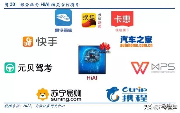 HiAI 是华为推出的针对麒麟芯片,面向以手机为主的终端领域的 AI 平台。HiAI 已完成两代产品迭代,HiAI 1.0 于 2017年发布,并在搭载麒麟 970 的华为手机 P20 系列上首发兼容;HiAI 2.0 于 2018 年末发布,用于匹配麒麟 980,同时增添了一系列新功能。目前,HiAI已公 开的商业落地项目达 11 项,其中包含苏宁、快手、WPS 等大型企业。