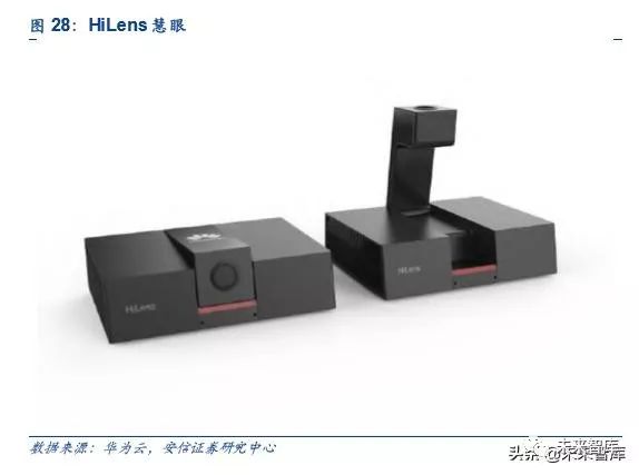搭载配套硬件,端云协同推理。华为为 Hilens 提供具备 AI 推理能力的摄像机,HiLens 慧眼。HiLens 慧眼针对开发者专用于端云协同视觉应用开发,搭载华为昇腾芯片,处理能力达到 100 帧/秒。Hilens 利用端侧配套硬件设备协同云侧算法模型训练,通过端云协同推理,平衡 低计算时延和高精度。通过端侧分析数据,节约云端存储的成本。