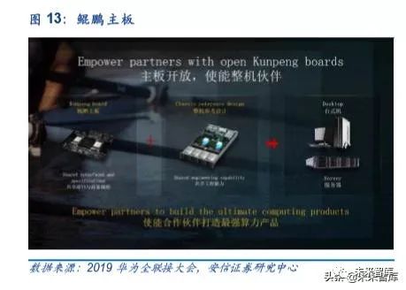 打造集成产品,渗透民商两用。鲲鹏不仅仅是一款单一的芯片,更通过集成硬件进行了大量的产品拓展。鲲鹏芯片在云端的主要承载是 TaiShan 系列服务器,是当前兼容 ARM 架构的 最强算力的通用服务器。面向数据中心分布式演进需求以及边缘计算需求。2019 华为全联 接大会,华为再次展出了鲲鹏主板,包括 PC 端与服务器端两款,并开放给合作伙伴。华为 鲲鹏主板采用多合一 SoC、xPU 高速互联、100GE 高速 I/O 等关键技术。它不仅搭载了鲲 鹏处理器,还内臵了 BMC 芯片、BIOS 软件。目前,华为已与清华同方等合作伙伴展开合作, 开发出自有品牌的服务器和台式机产品。