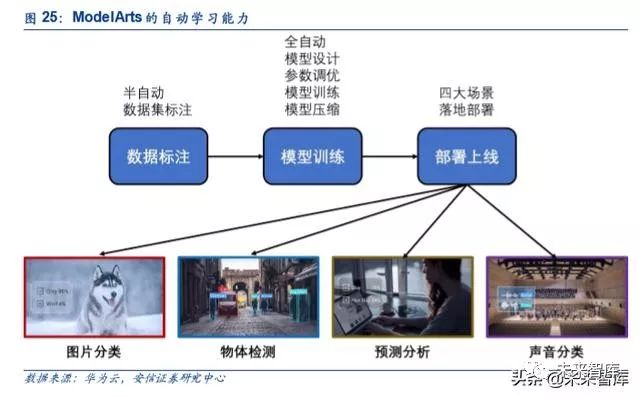 (1)自动学习:ModelArts 自动学习能力,可根据用户标注数据全自动进行模型设计、参数调优、模型训练、模型压缩和模型部署全流程。无需任何代码编写和模型开发经验,即可利 用 ModelArts 构建 AI 模型应用在实际业务中。