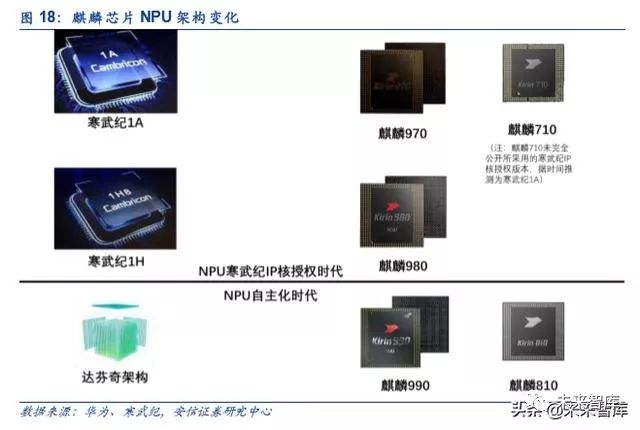 NPU 自主化,打造独立自主麒麟芯。麒麟芯片的 AI 功能最早从寒武纪获得技术支持。通过 IP 核授权的方式,麒麟 970 和麒麟 980 分别搭载了采用寒武纪 1A 和寒武纪 1H两款架构设 计的 NPU。自麒麟 810 芯片起,麒麟芯片开始搭载基于自研达芬奇架构的 NPU。最新的麒 麟 990 搭载了 NPU大核+NPU微核架构设计,其正是昇腾架构的分支版本 Ascend Lite 和 Ascend Tiny。华为在麒麟 810、麒麟 990 两款芯片的转变充分说明了华为已打通手机 AI 芯 片的底层技术,同时华为的昇腾架构也将逐步由服务器等云侧高性能计算场景逐步向端侧终 端设备拓展。