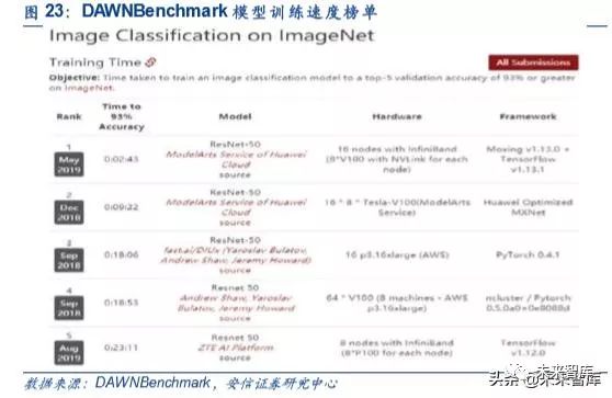 ModelArts 计算性能优异,DAWNBenchmark 上在两度霸榜。DAWNBenchmark 是由斯坦 福大学提出的针对图像识别应用场景的标准算力,也是各大厂商展示自身 AI 平台能力的主要指标之一。截止目前,ModelArts 两次在 DAWNBenchmark 模型训练速度评比中位列第一, 将利用ResNet-50训练 ImageNet 的时间降低至9分22 秒,并在近期再次降低到2分43秒。