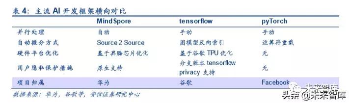 在发布昇腾系列 AI 芯片的同时,华为同样发布了配套昇腾芯片的 AI开发框架 MindSpore, 从而使华为成为继谷歌、Facebook 后另一家拥有自有 AI 开发框架的科技巨头。我们认为 MindSpore 具备以下优势: