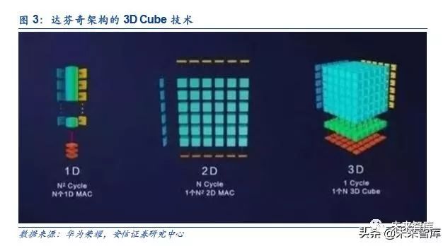 达芬奇架构,锁定 AI 算子级别优化。针对 AI 计算场景,华为研发了达芬奇指令集架构,具备高算力、高能效、灵活可裁剪的特性。达芬奇架构的主要特性是针对矩阵运算的3D Cube 技术。AI 计算过程中由于神经网络链式求导的需求,大量张量(高维矩阵)计算成为传统处 理器速度的瓶颈。3D Cube 技术针对矩阵运算做加速,使AI核心在一个时钟周期内实现4096 个 MAC 操作,从而相对 CPU和 GPU产生数量级的提升。