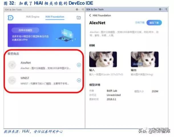 具备自研 IDE,提升开发效率。HiAI Foundation 为开发者提供基于移动设备的运行环境和调试工具,目前 HiAI平台已将相关功能集成到自研的 DevEco IDE。DevEco IDE 是华为消费 者业务为开发者提供的集成开发环境,帮助开发者快速使用华为 EMUI 的开放能力。通过调 用 EMUI AI相关接口,即可基于 HiAI开发移动端 AI 应用。