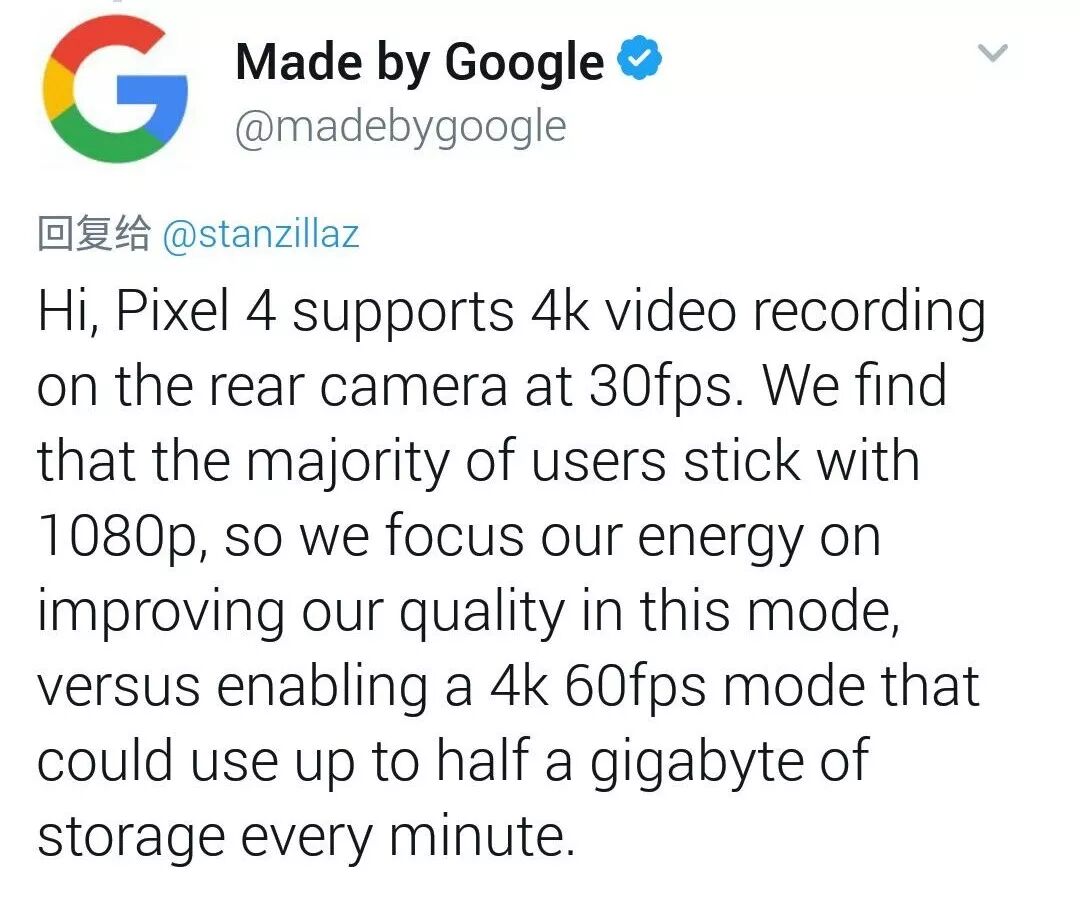 2:谷歌官方正式回应关于Pixel 4系列不支持4K 60fps的问题 此前,谷歌Pixel 4系列已经正式发布了,不过,这一代的机子不支持4K 60FPS。21日,谷歌官方正式回应关于Pixel 4系列不支持4K 60fps的问题,谷歌称因为大部分人都不需要这项目,其致力于打磨更好体验的4K 30fps,4K 60fps这项功能比较鸡肋且浪费手机空间。