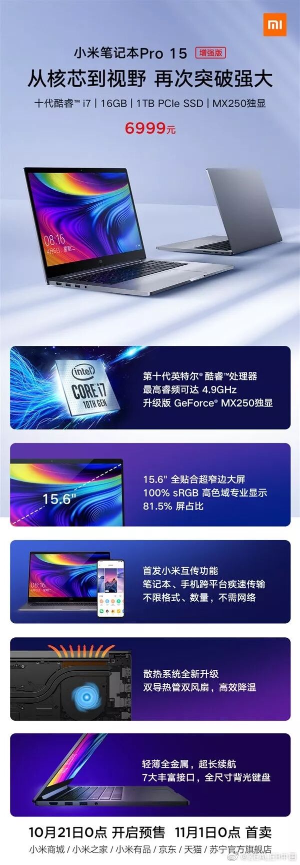 6:小米笔记本Pro 15发布,售价6999元 (ZEALER中国消息) 21日,小米发布了笔记本 Pro 15 增强版。增强版的处理器升级到了 Intel 第十代酷睿处理器。同时,该产品首发了小米互传功能。色域覆盖升级为 100% sRGB。首发版本配置为 i7 处理器 + 16GB RAM + 1TB SSD,售价 6999 元。