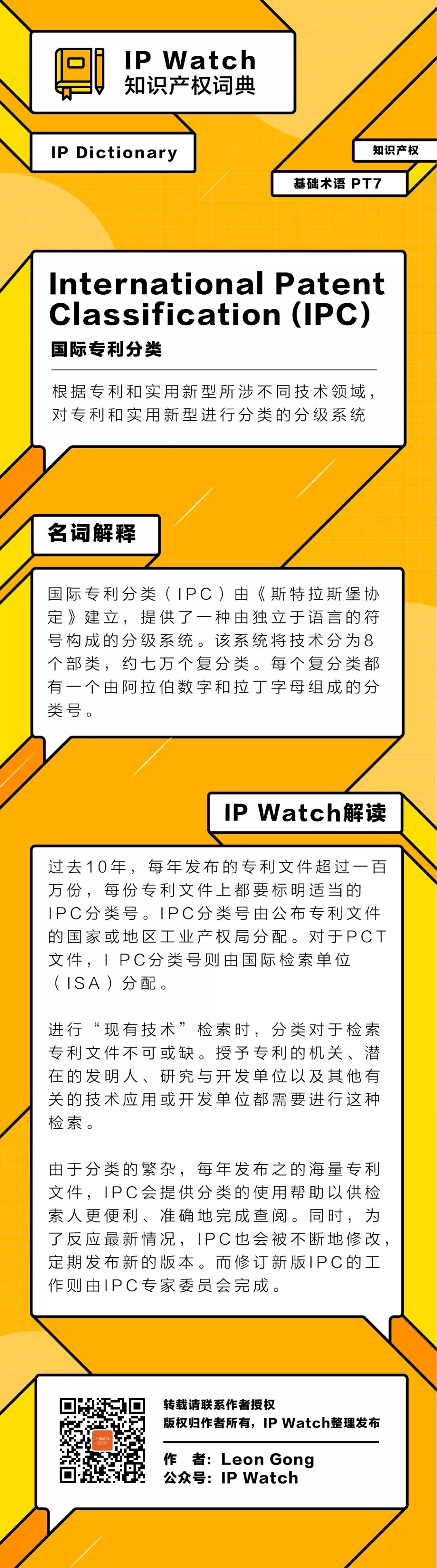 IP Watch 知产词典 现已上线,用简单明了的方式解读在申请国外商标时常常出现的专业术语,丰富你的知识储备。今日解释词语为 International Patent Classification (IPC),即国际专利分类。
