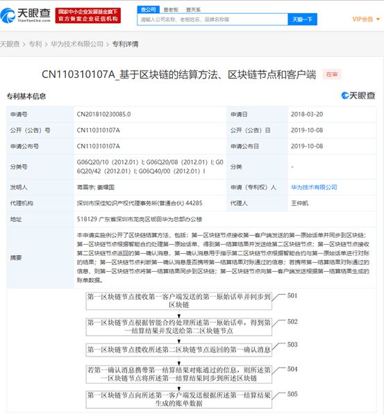 据天眼查数据,10月8日,华为申请了“基于区块链的结算方法、区块链节点和客户端”专利。