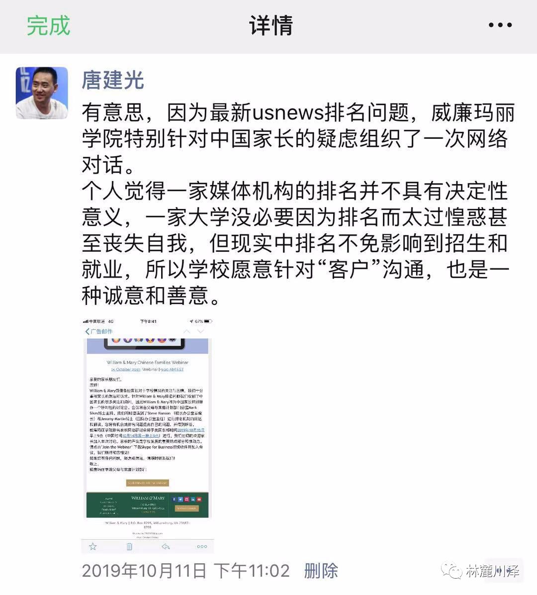 于是,我把这则信息发到了一个包括成都留学生及准留学生家长的群,并说明意在让更多潜在的申请者了解真实的W&M,了解美国大学的排名机制。没想到,很快就被拎到两个威玛家长群问罪: