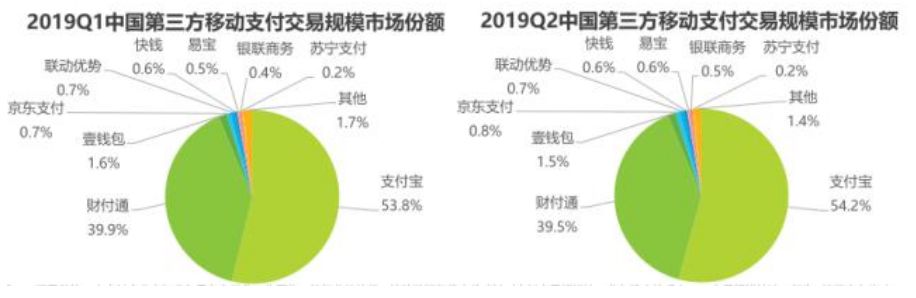 据艾瑞资讯发布的《2019年上半年中国第三方支付行业数据发布报告》显示,在2019年Q2,支付宝和财付通的市场份额最大,分别是54.2%和39.5%。