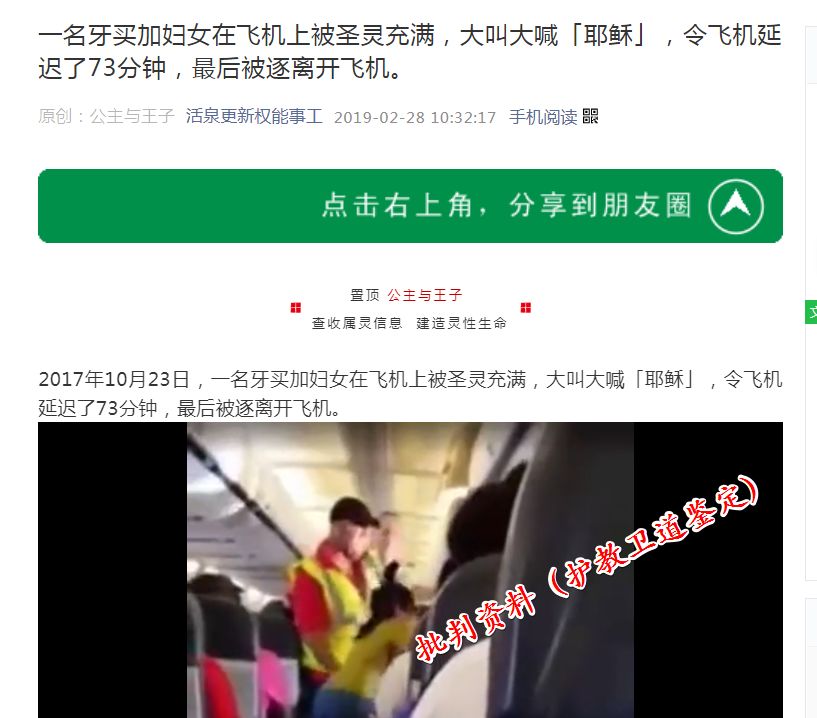 一名为〖活泉更新权能事工〗的公众号,在2019-02-28发布了《一名牙买加妇女在飞机上被圣灵充满,大叫大喊「耶稣」,令飞机延迟了73分钟,最后被逐离开飞机。》