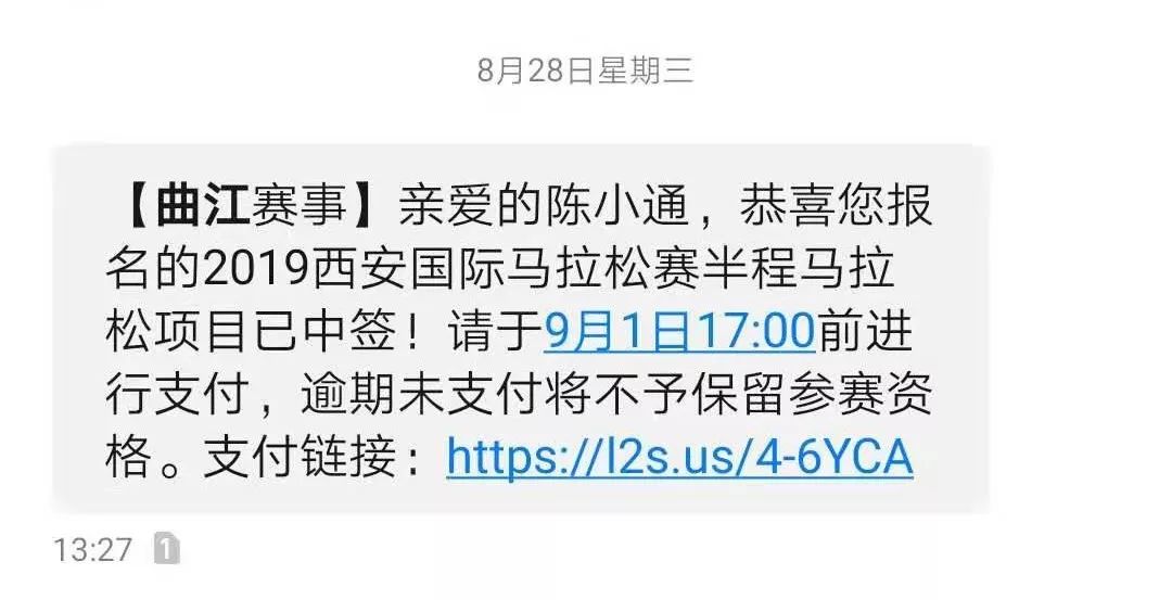 看了看比赛时间,刚好比赛期间我在西安,那就报名跑个半马吧,根本没想过中签的事。结果到了8月28号,来了中签短信通知,催着交钱,看来中签也不难,还以为要以往比赛成绩才行,后来才知道半马中签率真心的低,只有12.98%,顺便鄙视下中签不交钱的人。
